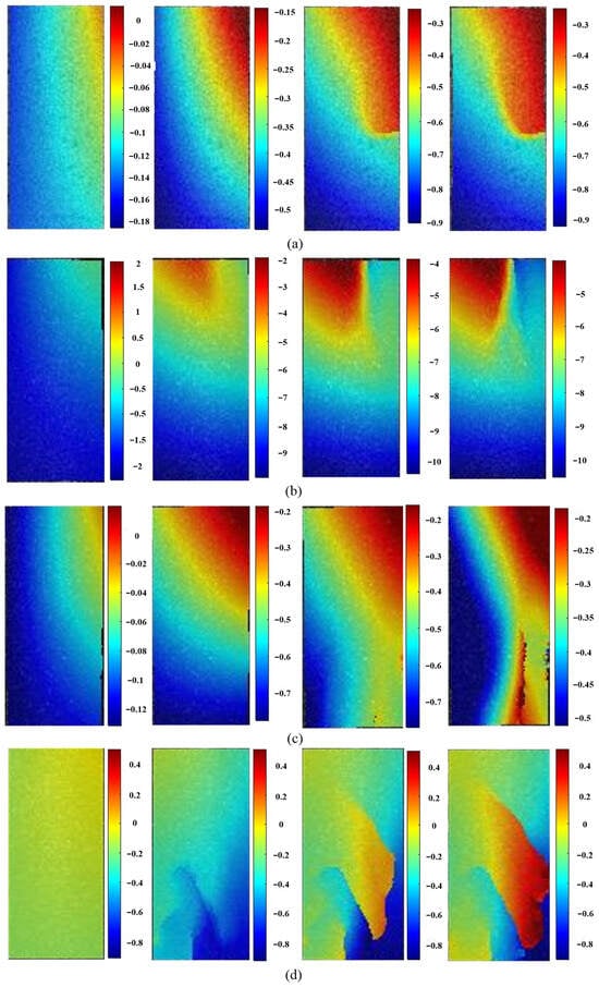 The DIC 3D full-field deformation and measurement system captures the speckle patterns, and by observing the speckle measurement points arranged on the rock sample, combined with the open-source speckle processing software Matlab-Ncorr (Version 2016), the displacement field evolution on the surface of the sample during uniaxial compression can be obtained. The vertical displacement field at typical moments during the loading phase is shown in Figure 14.