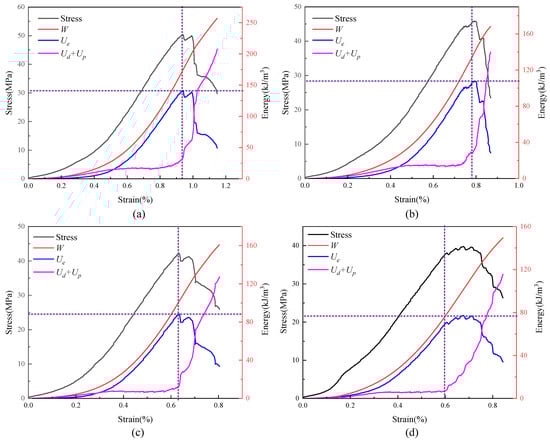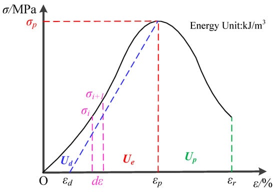 As shown in Figure 15, four energy values are involved in the energy analysis of uniaxial compression: the work done by the servo testing machine (W), the elastic strain energy stored in the rock sample (Ue), the dissipative energy used for the plastic deformation of the sample and crack propagation (Ud), and the energy consumed per unit volume during deformation and failure after the peak point (Up). Therefore, the entire stress–strain curve needs to be split into the pre-peak and post-peak stages, and the energy values for each section calculated. The formulas for each energy value are as follows: