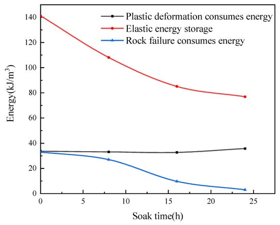 Figure 17 shows the relationship curve between the main characteristic points in energy evolution and soaking time. It can be seen from the figure that the energy input from the external load is primarily stored as elastic energy within the rock, while most of the dissipative energy is used for rock plastic deformation, with a small amount used for rock instability and failure. As the soaking time increases, both the elastic energy storage and the dissipative energy used for rock failure decrease. The dissipative energy used for plastic deformation increases slightly before 16 h of soaking, but significantly increases when the soaking time reaches 24 h. This indicates that as the soaking time increases, the plastic characteristics of the rock become more prominent. This is because water films tend to form between crack surfaces, reducing the friction coefficient and altering the microstructure and the connection state of the mineral particles. This reduces the cohesion between the particles, making the rock more susceptible to plastic shear behavior. After entering the post-peak stage, a smaller energy input is enough to trigger the instability and failure of the rock.