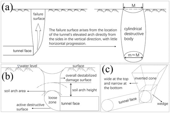 When the support pressure on the tunnel face is less than the soil and water pressure in front of it, the stratum in front of the tunnel face moves towards the tunnel. The interaction between the soils has a tendency to inhibit soil sliding, and the shear resistance increases. When the support force on the tunnel face decreases to a certain critical point, the displacement of the tunnel face suddenly increases sharply, and the tunnel face undergoes active damage. Established research results show that the damage pattern manifests as a chimney-like shear zone [,] when active damage occurs on the tunnel surface during shallow buried pipe jacking in sandy soil layers. The damage surface arises from the location of the tunnel’s elevated arch, directly from the sides in the vertical direction, with horizontal movement almost never occurring. The damage body is in the shape of a column with a small difference in width between its top and bottom (as shown in Figure 1a). When the water level is above the surface, the upper stratum in front of the tunnel face undergoes overall damage and slides downward to the surface [], as depicted in Figure 1b.