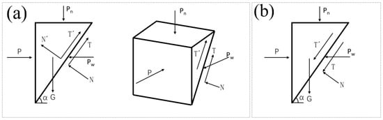 The force on the wedge-shaped block in front of the pipe-jacking tunnel face is as shown in Figure 2a. The meaning of each parameter in the figure is as follows: P is the support pressure on the tunnel face; Pw is the hydrostatic pressure exerted on the tunnel face; Pn is the vertical force acting on the top of the wedge block; G is the self-weight of the wedge block; T and N are the frictional force (upward direction for active damage and downward direction for passive damage) and the normal stress on the diagonal section of the wedge block, respectively; and T′ and N′, respectively, represent the frictional resistance (upward direction for active failure, downward direction for passive failure) and normal force on the sliding surfaces on both sides of the wedge-shaped block.