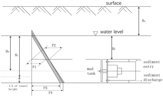 Keeping the tunnel-face support pressure, soil-layer groundwater pressure, and soil pressure in a balanced state is the key to ensuring the smooth construction of mud–water-balanced pipe jacking and reducing the impact of disturbance on the surrounding soil. In a pipe-jacking project, if the tunnel-face support pressure is not properly controlled, tunnel-face instability problems will be caused. When the tunnel-face support pressure is too low, the front soil is unloaded. And there is a large influx of soil into the mud and water silo, causing over-excavation, surface subsidence, and pipe-jacking obstruction. When the support pressure on the tunnel face is too high, the soil in front is compressed due to loading, causing uplift and damage in a certain area on the surface []. Therefore, in order to avoid problems such as surface subsidence with too much support pressure or uplift damage with too little support pressure, reasonable and accurate control of the support pressure on the tunnel face is key in mud–water-balanced pipe-jacking construction [].