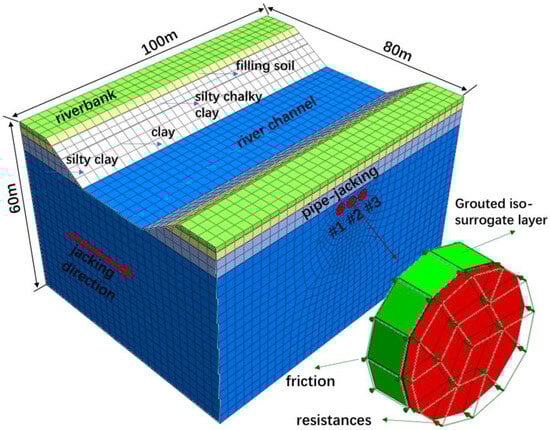 For pipe-jacking projects crossing a river, the grouting pressure, resistance, and friction between the pipe and soil should be considered. In order to highlight the main issues and reduce the amount of tedious work, we chose to simplify the conditions. Pipe jacking forms a boundary inside the formation and changes the original stress field of the formation, which leads to a series of complex physical and mechanical effects in the formation around the construction area. This is closely related not only to the physical properties of the formation but also to the construction method, construction process, and related construction parameters. When using numerical software for three-dimensional calculations of multi-line parallel pipe jacking, it is difficult to take all the factors of pipe jacking into account to completely and realistically reflect the construction process. Therefore, the mechanical behavior related to pipe jacking was appropriately simplified in our numerical simulations. This not only allowed the simulations to meet the requirements of the software for calculation but also led the numerical calculation results to better reflect the construction process and reveal the regularity of the construction’s impact. Based on the actual situation of the examined project, the numerical simulation included the following assumptions: