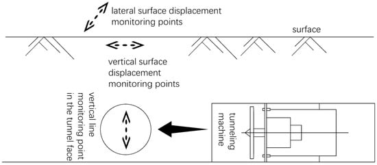 Displacement monitoring points were arranged on the center vertical line of the tunnel face and on the ground surface along lateral and vertical lines, as depicted in Figure 6.
