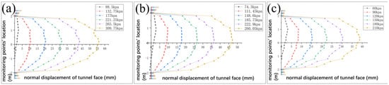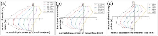 As shown in Figure 8, when the river overburden is 3 m, the support pressure exerted on the tunnel face increases from static soil pressure to passive soil pressure. The trend is the same when the river channel overburden is 2 m or 1 m. The displacement of the tunnel face increases along the soil direction. However, as the thickness of the overburden decreases, the displacement of the soil monitoring points caused by the passive support pressure continues to decrease. When  = 3 m, the maximum normal displacement of the tunnel face is 56 mm; when  = 2 m, it is 47 mm; and when  = 1 m, it is 38 mm.