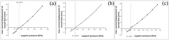 Plots of active support pressure versus tunnel-face displacement: (a) ; (b) ; (c) .