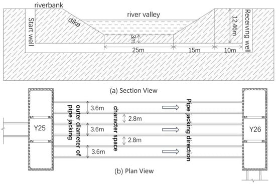 The place where the pipe jacking crosses the river: (a) section view; (b) plan view.