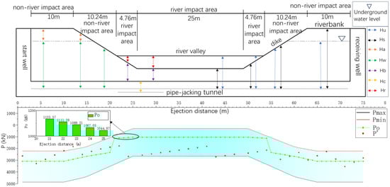 In Figure 11, according to the principle of optimal value calculation, the jacking area was divided into a non-river impact area (0–20.24 m and 54.76–75 m) and a river impact area (20.24–54.76 m). The underground water level was −3 m from the surface of the riverbank. The construction stratum was located in a silty clay layer, and  was the static soil pressure coefficient, taken as 0.7. The heights described by Ha, Hb, Hc, Hr, Hs, Hu, and Hw in the above equation are also given in the upper part of Figure 11. The dimension of the simple model of the project in the upper half of Figure 11 was kept the same as the jacking length in the bottom half of the figure. The bottom half of Figure 11 describes the upper limit value Pmax, the lower limit value Pmin, the optimal value Po, and the measured value P′ of the support pressure on the tunnel face for different jacking distances. A partial enlargement of the optimum value for jacking distances from 20.24 m to 25 m is also given.