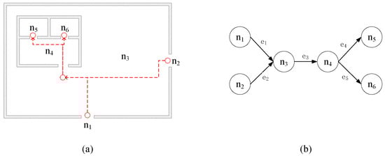 Example of physical protection system modeling under Space L rule. (a) shows a schematic diagram of a physical protection system (PPS), where red lines indicate inter-zone connecting paths. As illustrated in (a), nodes n1 and n2 represent vehicle and pedestrian access points on the perimeter, providing access to n3 (an outdoor area within the PPS) and, subsequently, to n4 (internal building passageways), ultimately leading to zones n5 and n6 (rooms housing critical assets). (b) demonstrates its complex network representation, where directional edges encode reachability relationships between zones.