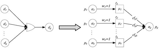 - The fuzzy Petri net transformed from the “AND” rule is shown in Figure 2, where,