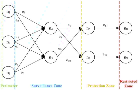 In public transportation planning, researchers have adopted the Space-L complex network modeling method to analyze bus routes and stations. This method constructs topological models of transit networks by treating bus stations as nodes and adjacency relationships between stations as edges [26,27]. Similarly, in PPSs, protection zones and their connecting pathways can be abstracted as nodes and edges in complex networks, making the Space-L method applicable for protection system modeling. The core principle states that an edge exists between two nodes if direct or indirect connecting paths exist between them, while no edge is established for nodes without physical connections in real environments [28]. This modeling approach effectively characterizes PPS topology, providing a foundation for subsequent vulnerability analysis.
