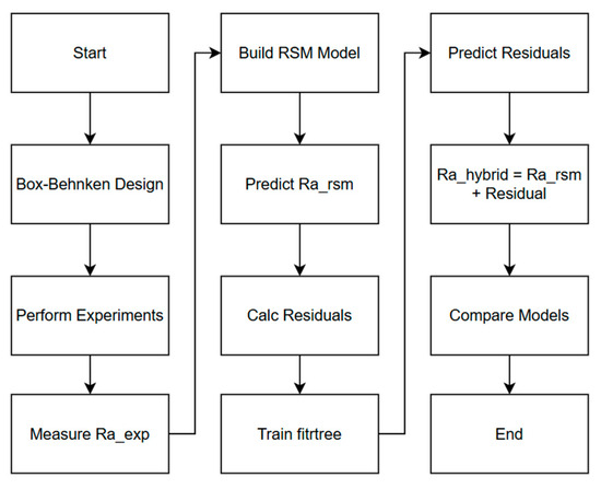 In this study, a hybrid modeling strategy was employed by combining the classical response surface methodology (RSM) with machine learning (ML). The RSM approach was applied to develop a regression model based on the Box–Behnken experimental design. Residuals between the experimental and predicted values of surface roughness were subsequently modeled using the regression tree algorithm (fitrtree). This enabled the correction of systematic deviations and improved the accuracy of the predictions. The final model combines RSM predictions with ML-based residual corrections, offering enhanced adaptability to nonlinear behavior. The process is illustrated in Figure 1.