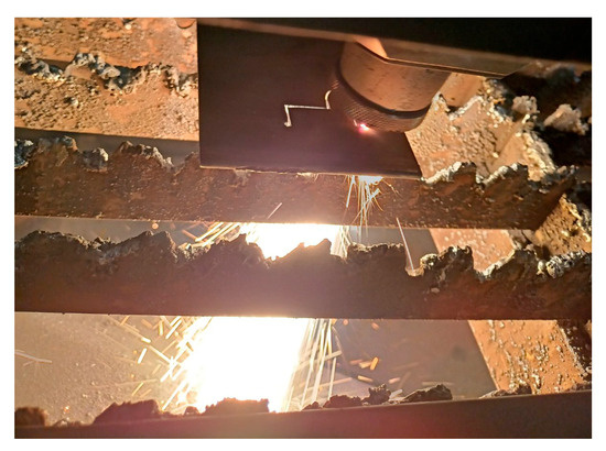 An illustration of a steel sheet cutting experiment is presented in Figure 2. In all experiments, various laser cutting parameters were kept constant to ensure process stability and repeatability. Oxygen was used as the auxiliary gas, and a constant nozzle configuration with a double nozzle of 1.5 mm diameter was used. The cutting height was maintained at 0.7 mm, while the laser frequency was set to 5000 Hz. The laser focus position was set at −3.8 mm and the focus setting of the device was kept at +2.6. These parameters were chosen based on manufacturer recommendations to ensure consistent cutting conditions across all trials.