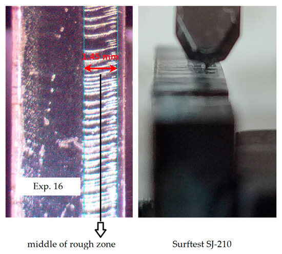 The surface roughness was evaluated with the average roughness parameter Ra, which was measured with a Mitutoyo Surftest SJ-210 (Mitutoyo Corporation, Kawasaki, Japan). The laser-cut surface usually consists of three different zones: the initial entry zone that occurs when the laser beam penetrates the material, a smooth zone that results from a stable cut, and a rough zone at the bottom, where the roughness is most pronounced. In this study, the width of the rough zone was used as a key indicator of cut quality, as it is the most sensitive to irregularities during processing. The roughness measurements were taken in the middle of this rough zone (Figure 3).