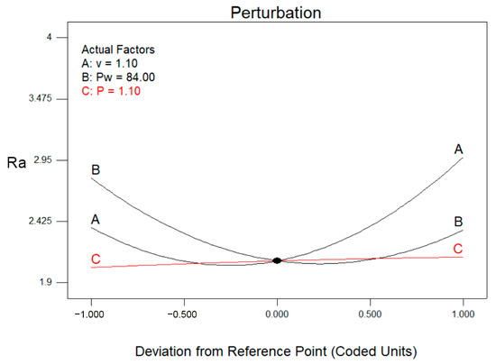 The influence of each process parameter on surface roughness (Ra) was further analyzed using a perturbation diagram, which illustrates the effects of changing one factor at a time while keeping the others at their central values. As can be seen in Figure 4, cutting speed (A) has the greatest influence on Ra, followed by laser power (B), while auxiliary gas pressure (C) has a relatively small influence. The dominant influence of cutting speed can be attributed to the phenomenon of melt jet retardation at higher speeds, where the interaction between the molten material and the assist gas is less effective. This delay can lead to incomplete material removal and an increase in surface roughness. Laser power also has a significant impact on Ra, as more energy enters the cutting zone at higher power, increasing the amount of molten material and potentially creating a rougher surface if it is not ejected properly. Although gas pressure showed a limited impact on surface roughness within the experimental range, its presence remains essential for maintaining cut quality. It facilitates the efficient removal of molten material and prevents dross formation, contributing to cleaner and more stable cutting conditions.