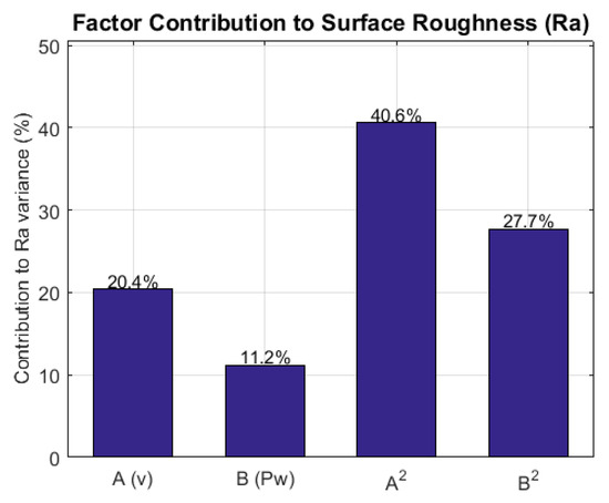 To complement the qualitative analysis of the perturbation diagram (Figure 4), a quantitative sensitivity analysis is presented in Figure 5. The contribution of each significant factor from the reduced RSM model was calculated based on the normalized sum of squares from the ANOVA. As can be seen from the bar chart, the quadratic term A2 (cutting speed squared) had the greatest influence on surface roughness, contributing approximately 40.6%, followed by B2 (laser power squared) at 27.7%, A (cutting speed) at 20.4%, and B (laser power) at 11.2%.