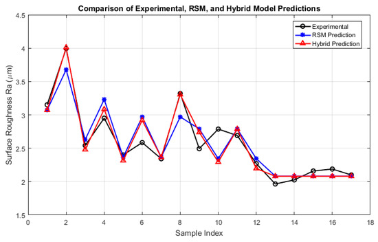 Comparison of experimental surface roughness values, RSM model predictions, and hybrid model predictions.