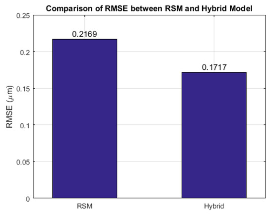Root mean square error (RMSE) of the RSM and hybrid models. The hybrid model reduced the RMSE by 20.85% compared to the RSM model.
