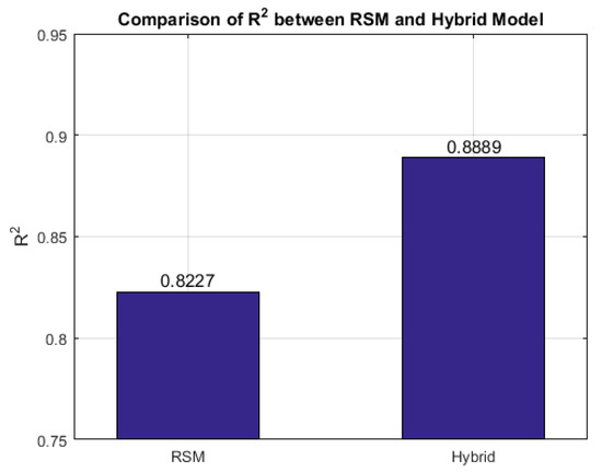 Coefficient of determination (R2) for the RSM and hybrid models. The hybrid model shows an 8.04% improvement in R2 over the RSM model, indicating a better fit to the experimental data.