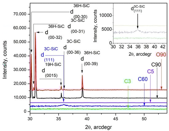 It is also obvious that during the carbonization of C60 (blue trace in Figure 1), the crystallites of the thin films are in the nanoscale range, as the I-denoted reflection arising from the (111) planes of cubic 3C–SiC (cubic symmetry (SG #216 F-43m and cell parameter a0 = 3.3480 Å) [28] becomes weak and very broad. There is no trace of crystalline phases in the diffraction patterns obtained from samples C3, O3, C5, and O5 (Figure 1).