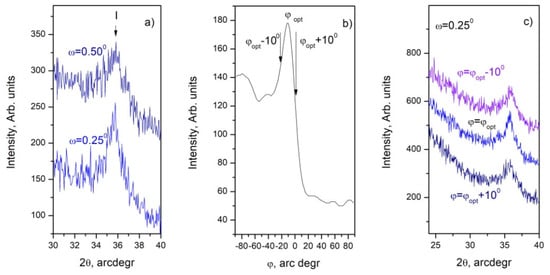 To clarify the structural quality of the thin films from the C60 samples, GIXRD was used in φ and (ω−2θ) scans. The value of the optimal grazing angle (ω) was determined by (ω−2θ) scans to be ω = 0.25°, which corresponds to the maximum intensity of the d(111) peak (Figure 2a). We used φ scans in the range φ = (0–180)° regarding d(111) = 2.5103 Å of 3C–SiC at 2θ = 37.75° [28] (Figure 2a) and to determine the most preferred orientation for further GIXRD studies. A change in the number of the counts per second (cps) between 2 and 3 times compared to the optimal orientation at φopt was found; with deviations of 100 relative to φopt, the signal decreases by 15–25% (Figure 2b). Furthermore, the GIXRD patterns in (ω−2θ) scans taken at φopt as well as (φopt − 10°) and (φopt + 10°) and ω = 0.25°, presented in Figure 2c, show the real change of the maximum intensity of the d(111) peak [28] at the corresponding conditions.