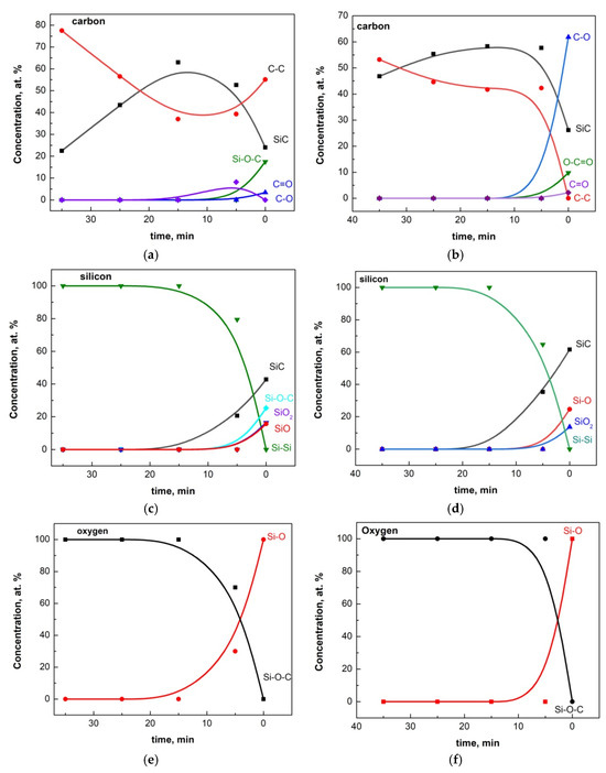 The normalized in-depth distributions are presented in Figure 4a–f. For each sputtering time, the recorded C 1s, O 1s, and Si 2p XPS spectra were fitted, and as a result of the fitting, the similar evolution of depth profiles was drawn by components. At each sputtering, the recorded C 1s, O 1s, and Si 2p photoelectron spectra were fitted, and as a result of the fitting, the similar evolution of depth profiles was drawn out by components. It should be noted here that prolonged sputtering will lead to a significant increase in the information depth and to a decrease in resolution due to surface roughening. In a compound material such as SiC, the silicon atoms are more rapidly removed than the carbon atoms. Thus, the Si/C ratio may be observed close to 1/3 instead of the expected 1/1 [32]. A significant result of these studies is the established diffusion of oxygen and carbon atoms as silicon oxide with variable composition and as Si−O−C ensembles in the regions near the surface of Si substrates.