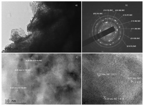 Another important observation is that both SAED and HRTEM images of thin films synthesized on substrates with a properly removed native oxide can be indexed in ordered phase 36H–SiC only [25]. All interplanar distances in the HRTEM images (Figure 6c,d, Figure 8b, Figure 9c and Figure S6b) were also determined, and we found that they correspond to the indicated polytype of SiC, namely 36H–SiC [25]. The analysis of the SAED and HRTEM images taken from samples from which the native oxide was not properly removed (Figure 7b and Figure S6b) showed the presence of ordered phases based on SiO2—both crystalline SiO2 [33] and the complex compound Si(OCOCH3)4 [34].