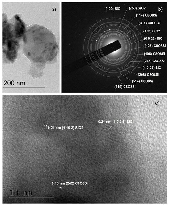 TEM images obtained from sample C90: an overview image of a micro-sized sample particle; a large part of the surrounding space (panel (a)), the corresponding SAED (panel (b)) images; and HRTEM images showing well-structured SiC nanocrystals (panel (c)).