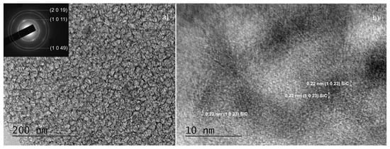 TEM images obtained from sample C60: a low magnification TEM and the corresponding SAED images (see inset) (panel (a)) and HRTEM image indicating the presence of a single SiC phase (panel (b)).