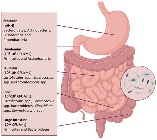 The stomach contains a relatively low number of microorganisms (<103 CFU/mL) compared to the distal regions of the GIT, due to its motile activity, gastric acid secretion, and low pH (<4). Gastric lumen harbours bacteria from the phyla Bacteroidota, Actinomycetota, Fusobacteria, and Pseudomonadota, while the mucosa is colonised primarily by Bacillota and Pseudomonadota [40]. Despite the hostile environment, acid-tolerant or transient species belonging to the genera Neisseria, Haemophilus, Fusobacterium, Prevotella, Veillonella, and Streptococcus have been detected in the gastric microbiota of healthy individuals. This microbial presence is likely due to the constant influx of bacteria originating from the oral cavity via swallowing, as well as reflux from the duodenum. Indeed, more than 65% of bacterial phylotypes identified in the stomach correspond to those found in the oral microbiota, suggesting that species, such as Veillonella, Lactobacillus, and Clostridium, detected in gastric samples may largely represent transient populations rather than established residents [41,42].