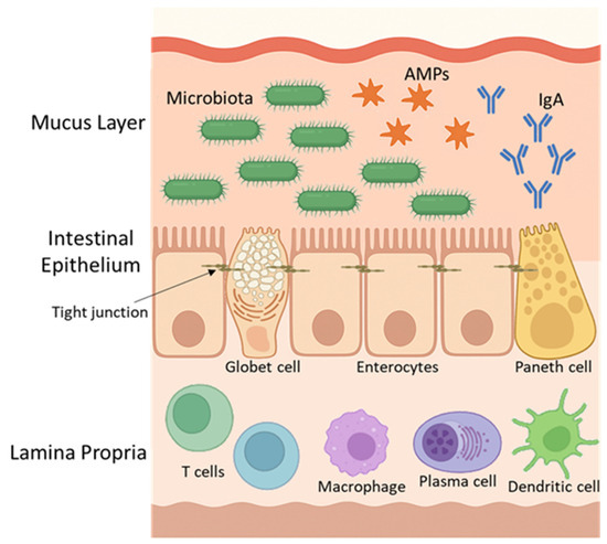 The mucus layer, secreted primarily by Globet cells, consists of a physical barrier that harbours beneficial commensal microorganisms, such as Bacteroides spp., Faecalibacterium prausnitzii, and Akkermansia muciniphila, and contains defence proteins with immune-regulatory functions, including antimicrobial peptides (AMPs) and secretory IgA, which are secreted primarily by Paneth cells and plasma cells, respectively [74,75]. Beneath this layer lies a continuous and polarised monolayer of intestinal epithelial cells, under which the lamina propria contains immune cells such as T cells, B cells, macrophages, and dendritic cells, which provide both innate and adaptive immune responses that reinforce intestinal defence [68,76]. A schematic representation of the intestinal barrier, including the mucus layer, epithelial cell monolayer, and immune cell populations in the lamina propria, is provided in Figure 2 to illustrate these components and their spatial organisation.