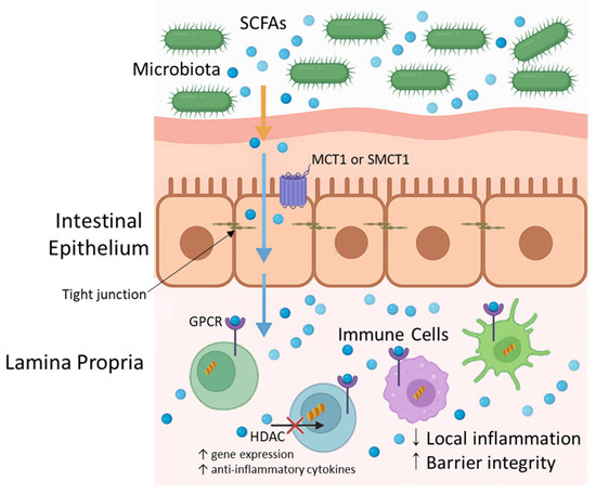 On the other hand, microbiota-derived SCFAs regulate immune cells by binding to G-protein-coupled receptors (GPCRs) and by altering gene expression through the reduction in histone deacetylase activity. Although the intestinal epithelial barrier separates microbes from the immune cells in the lamina propria, SCFAs, being small and soluble, can diffuse through epithelial cells via passive diffusion or be transported by specific monocarboxylate transporters (e.g., MCT1, SMCT1). Once in the lamina propria, they act on various immune cell populations. This results in decreased local inflammation, protection against pathogen infiltration, and the maintenance of the integrity of the intestinal barrier [8,77]. This process is illustrated in Figure 3.