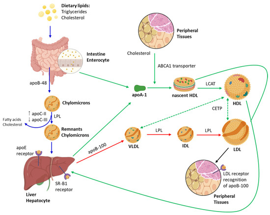Overview of lipoprotein metabolism: exogenous pathway, endogenous pathway, and reverse cholesterol transport. This schematic illustrates the major pathways of the human lipoprotein metabolism, encompassing its synthesis, transformation, clearance, and the key proteins involved in lipid transport and regulation. Blue arrows represent the exogenous pathway, which begins with the absorption of dietary lipids in the small intestine and the assembly of chylomicrons, rich in triglycerides and apolipoprotein B-48 (ApoB-48). Chylomicrons deliver triglycerides to peripheral tissues, such as adipose and muscle, through the action of lipoprotein lipase (LPL), which is activated by apolipoprotein C-II (ApoC-II). Apolipoprotein C-III (ApoC-III) acts as an inhibitor of LPL activity and the hepatic clearance of triglyceride-rich particles, thereby modulating plasma triglyceride levels. After triglyceride depletion, chylomicron remnants enriched in apolipoprotein E (ApoE) are taken up by the liver. Red arrows represent the endogenous pathway, in which the liver synthesises and secretes very-low-density lipoproteins (VLDL), containing ApoB-100 and triglycerides. As VLDL particles are hydrolysed by LPL, they are progressively transformed into intermediate-density lipoproteins (IDL) and, subsequently, into low-density lipoproteins (LDL). LDL particles, enriched in cholesterol, deliver cholesterol to peripheral tissues via LDL receptors that specifically recognise ApoB-100. Green arrows indicate the reverse cholesterol transport pathway, a key mechanism for maintaining cholesterol homeostasis. High-density lipoprotein (HDL) is synthesised in a nascent, discoidal form (pre-β HDL) by the liver and intestine, incorporating ApoA-I. HDL acquires cholesterol from peripheral tissues via the ATP-binding cassette transporter A1 (ABCA1). Cholesterol is esterified by lecithin–cholesterol acyltransferase (LCAT), leading to the formation of mature, spherical HDL. Cholesterol is returned to the liver via interactions with the scavenger receptor class B type I (SR-B1). The cholesteryl ester transfer protein (CETP) mediates the bidirectional exchange of cholesteryl esters and triglycerides between HDL and ApoB-containing lipoproteins (VLDL and LDL), contributing to lipid redistribution among lipoprotein classes.
