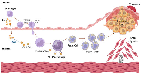 The recruitment of monocytes from the bloodstream to the affected area of the endothelium is the first step in a cascade of subsequent events. Initially, monocytes are captured and roll along the endothelium surface, a process mediated by P-selectin, followed by their tight adhesion through their interactions with the endothelial VCAM-1 and ICAM-1. Chemokines, including CXCL1, CXCL2, CXCL4, and CCL5, present in the endothelial surface, activate monocytes as they roll, increasing their adhesiveness [108]. Subsequently, MCP-1 and IL-8 induce the transmigration of monocytes to the subendothelial space, where they mature and differentiate into macrophages, which can polarise into M1 (pro-inflammatory) or M2 (anti-inflammatory) phenotypes, with the M1 predominating when the disease progresses. However, due to their sensitivity and plasticity, these macrophages can switch between M1 and M2 phenotypes in response to new signals [120].