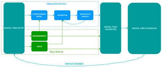 Once the setup is ready, the next step is to conduct different tests and measurements with the real vehicle. These tests are crucial for obtaining precise and reliable data that will serve as a reference for all the different steps adjusting the digital twin. Some of the tests are going to be direct and simple measurements, while in other cases, it may be necessary to perform estimations based on the results of the towing tank tests, position or orientation values over time, etc. To ensure the accuracy of the simulation model, it is necessary to cover a wide range of operating conditions, and the tests should be designed in such a way that they allow the acquisition of all the information needed to accurately model the real vehicle’s behavior.