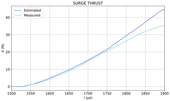 Figure 3 shows the measured and estimated thrust for the x axis () at different PWM values of the input signal (I). The first curve was obtained directly from the measurements, while the estimated one was obtained from the individual curves and the geometry configuration. In this specific case, assuming the same response for the four horizontal thrusters and as the individual thrust of each one, obtained from [46], we could express the estimated as: