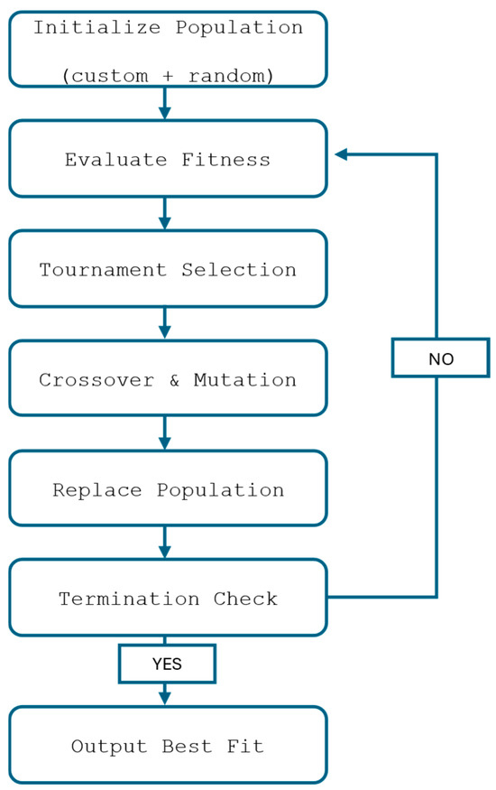 In this subsection, we provide a detailed description of the GA employed for optimizing parameter values in our study. In our specific case, a genetic algorithm from the Python DEAP library (version 1.4.1) [47] was selected to optimize the values of the hydrodynamic model. The optimization process, represented in Figure 5, began with the initialization of a population of candidate solutions. Each individual in the population represented a candidate solution composed of a set of dynamic parameters (e.g., added mass, damping coefficients, and inertia), and the algorithm evolved the population over several generations to maximize a fitness function based on the similarity between the simulated and real trajectories.