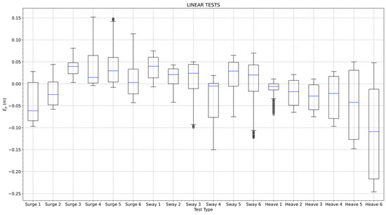 With the digital twin adjusted, a series of tests were performed to evaluate the effectiveness of the proposed solution. Figure 6 shows the position error (Ep) distribution for the linear validation tests, where the error values represent the difference between the real and simulated positions of the vehicle for each movement. Each group of boxplots corresponds to a specific linear motion: surge, sway, and heave. The tests consisted of six isolated movements along each axis, similar to those used during algorithm training, but with different amplitudes.