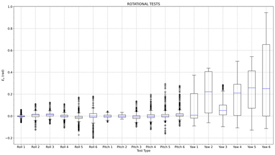 Figure 7 shows the orientation error (Eo) distribution for the rotational validation tests where the error values represent the difference between the real and simulated orientations of the vehicle for each rotational movement. Each group of boxplots corresponds to a specific rotation (roll, pitch, and yaw). For roll and pitch, six tests were carried out up to the stability limit for the robot in these degrees of freedom. Beyond that point, the vehicle became unstable and tended to capsize, making it difficult to obtain reliable or repeatable results. In contrast, yaw rotations were tested over a wider propeller speed range, provided that the motion remained controllable and representative of real operational conditions, as high speeds in these tests did not compromise the robot’s stability.