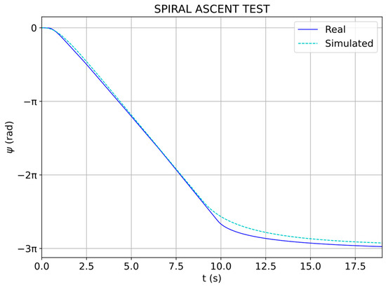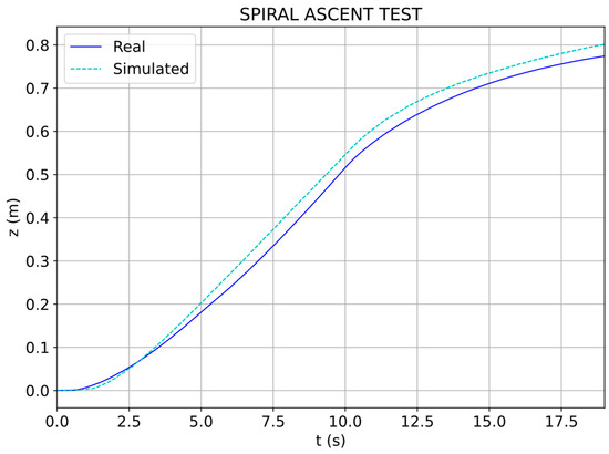 To validate the decoupled motion assumption and assess the model’s adequacy and generalization capability, a spiral ascent test was conducted. The results are illustrated in Figure 9 and Figure 10, which respectively compare the heave displacement and yaw angle over time, for both the real system and the simulation model. Both the heave displacement and the yaw evolution during the combined maneuver exhibited a high level of agreement between the real and simulated data, particularly during the actuated phase of the motion. Minor deviations observed in the latter part of the test can be attributed to unmodeled external effects, such as disturbances introduced by the tether or the discarded coupling effects.