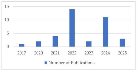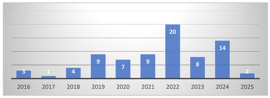 Since very few articles were reached because of the determined keywords, the word barrier was removed from the keywords, and a new search was conducted only for the keyword Maintenance 4.0. 77 studies were conducted on Maintenance 4.0 between 2016 and 2025. The distribution of publications by year is given in
