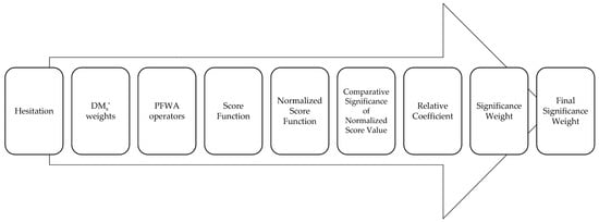Table 8 for the criteria, the PFWA value is calculated using Equation (7). Subsequently, the score function is computed using Equation (9). This score function value is then normalized using Equation (5) to obtain the normalized score function. Following this, the comparative significance of the normalized score value (