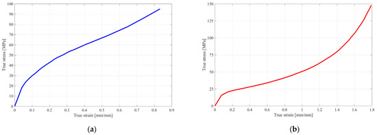 Both material 24 and material 89 can be used to simulate the forming process of polymeric materials. Material model 24 is widely used in Ls-Dyna R13.1.0 due to its robust algorithms, computational efficiency, and support for load curve-based input. For material 24, it is necessary to enter, as input data for the plastic zone, the true stress–strain curve from which the elastic component is removed. The hardening slope in the true stress–strain curve must not exceed the initial modulus. Otherwise, it can lead to significant errors in the simulation, especially during repeated loading–unloading. By default, the hardening behaviour is explicitly defined through a user-specified true stress–strain curve, as shown below [22]: