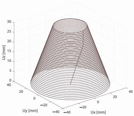 In the simulated incremental forming process, it is only the punch that moves, while the blankholder constantly presses the blank with a force of 2 kN. Since the desired trajectory is a frustum of cone-type trajectory, a spiral trajectory was chosen, presented in Figure 3.