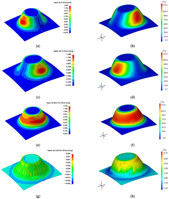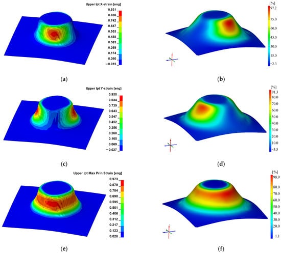 Material 24 for polyamide gives the following differences: 2.55% for the specific strain εx, 1.44% for the specific strain εy, 0.52% for the major strain ε1, 14.7% for the minor strain ε2, and 0.52% for the relative thickness reduction, as presented in Table 2. Material 89 for polyamide gives the following differences: 4.21% for the specific strain εx, 2.74% for the specific strain εy, 2.84% for the major strain ε1, 15.55% for the minor strain ε2, and 2.99% for the thickness reduction.