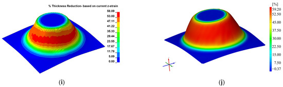 Given the fact that four analyses were performed, two for each type of material, with the two material definition options presented above, the results obtained experimentally were compared with those obtained by the simulation using the finite element method. Figure 5 and Figure 6 show the results obtained for the strains and thickness reduction when using material model 24 for polyamide and material model 89 for polyethylene. For the two figures, the left columns (Figure 5a,c,e,g,i and Figure 6a,c,e,g,i) represent the results of the FEM simulation, while the right columns (Figure 5b,d,f,h,j and Figure 6b,d,f,h,j) represent the experimental results.