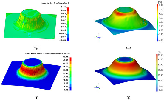 (a) Strain on x direction for FEM using material 24 for simulating PA 6.6; (b) strain on x direction determined experimentally for PA 6.6; (c) strain on y direction for FEM using material 24 for simulating PA 6.6; (d) strain on y direction determined experimentally for PA 6.6; (e) major strain for FEM using material 24 for simulating PA 6.6; (f) major strain determined experimentally for PA 6.6; (g) minor strain for FEM using material 24 for simulating PA 6.6; (h) minor strain determined experimentally for PA 6.6; (i) thickness reduction for FEM using material 24 for simulating PA 6.6; (j) thickness reduction determined experimentally for PA 6.6.