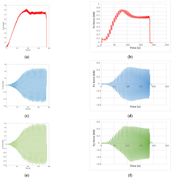 (a) Force variation on z direction for FEM using material 89 for simulating PEHD 1000; (b) force variation on z direction determined experimentally for PEHD 1000; (c) force variation on x direction for FEM using material 89 for simulating PEHD 1000; (d) force variation on x direction determined experimentally for PEHD 1000; (e) force variation on y direction for FEM using material 89 for simulating PEHD 1000; (f) force variation on y direction determined experimentally for PEHD 1000.