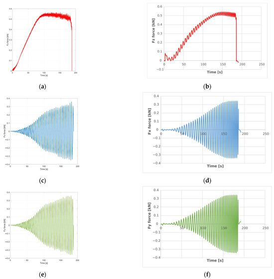 (a) Force variation on z direction for FEM using material 89 for simulating PA 6.6; (b) force variation on z direction determined experimentally for PA 6.6; (c) force variation on x direction for FEM using material 89 for simulating PA 6.6; (d) force variation on x direction determined experimentally for PA 6.6; (e) force variation on y direction for FEM using material 89 for simulating PA 6.6; (f) force variation on y direction determined experimentally for PA 6.6.
