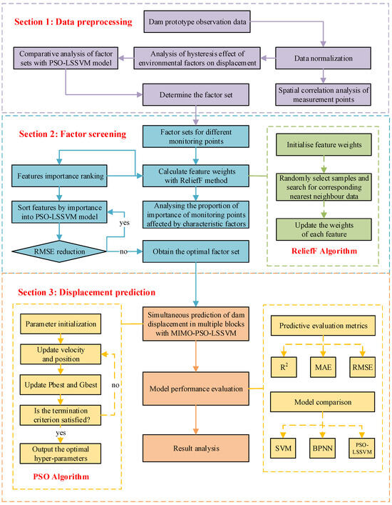 Step 5: Establishing a MIMO model for synchronous prediction of dam displacement in multiple blocks. After filtering by feature selection, a uniform factor set of measurement points in the same area is determined. The synchronous prediction of dam displacements at multiple measurement points is then realized based on the MIMO-PSO-LSSVM model.